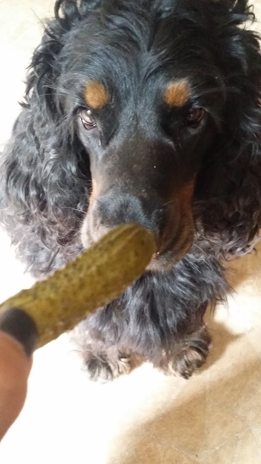 Da Stimpy sowas von auf Gewürzgurken abfährt hat sie natürlich eine abbekommen ;) Und zack! Glücklich war der kleine süße Cocker :)